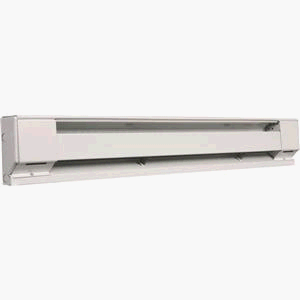 500 Watt electric baseboard heater is designed for quiet operation - there's no popping or pinging typically associated with baseboard heaters. Heating element combines durability of a steel tubular heater with excellent heat transfer characteristics of aluminum fins. Chimney fin directs airflow away from walls to maximize circulation. U.S.A. Heating Application: Wall, Baseboard, Volts: 240, Watts: 500, Blower Included: No, Blower (CFM): N/A, Power Cord (ft.): Must be hardwired, Remote Included: No, Dimensions L x W x H (in.): 28 x 3 x 7 1/2
